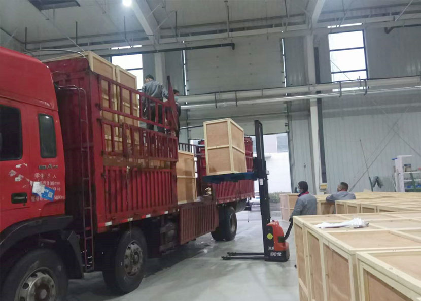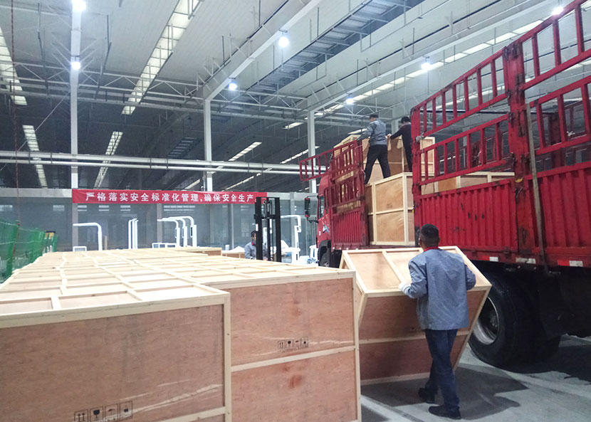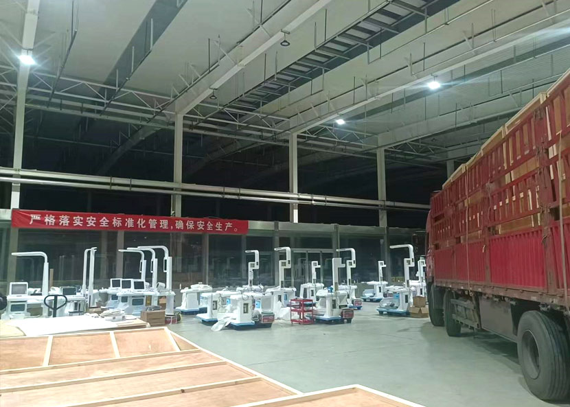 每一臺體檢機都由獨立大型木質包裝箱嚴格密封,以此保證運輸過程中設備完好,順利抵達客戶端。夜間,工人們正在加班裝車搬運中....